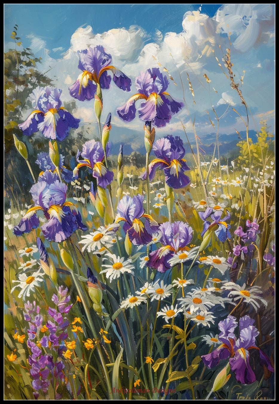 Irises and Oxeye Daisies - Counted Cross Stitch Patterns Embroidery Crafts Needlework DIY Chart DMC Color