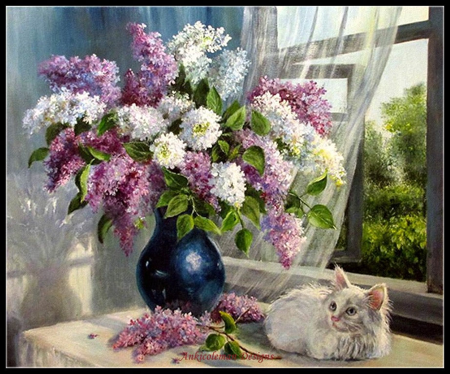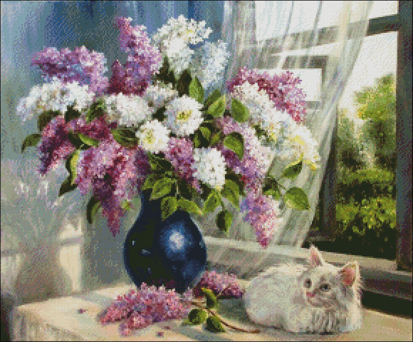 Lilacs with a Cat - Counted Cross Stitch Patterns Embroidery Crafts Needlework DIY Chart DMC Color