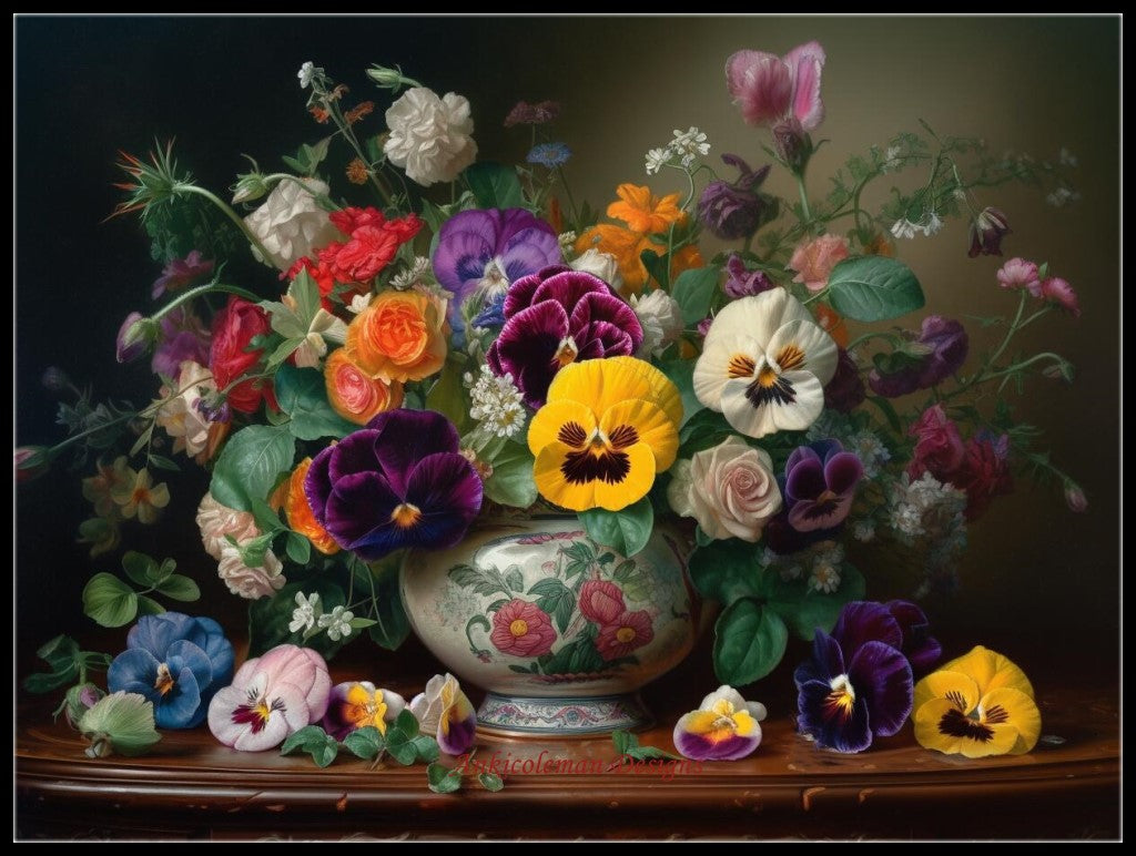 Pansies in Vase - Counted Cross Stitch Patterns Embroidery Crafts Needlework DIY Chart DMC Color