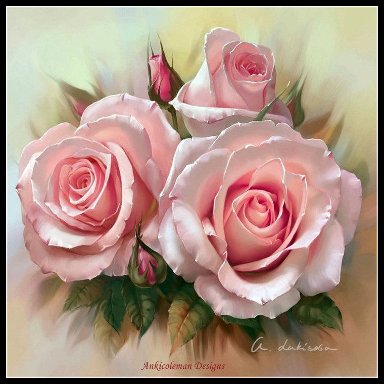 Pink Roses 5 - Counted Cross Stitch Patterns Embroidery Crafts Needlework DIY Chart DMC Color